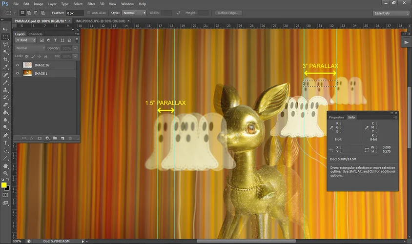 The technical goal of all of this work is to create an image sequence with parallax numbers that make sense and yield good depth. Verify your parallax by overlaying your leftmost and rightmost images at intended print size. Bring your far left and far right images into photoshop and layer them over each other, reducing the top layer opacity temporarily so you can see features of both images. Align the images to your chosen point of convergence if you haven’t done so through your shooting method. Crop the image just as you want it to appear in the final print and, importantly, set the image size to be exactly what you intend for the final print. Now you can measure your parallax. Find the closest object in your scene and compare the distance between the left view and the right view. In photoshop this can be done with the marque tool and the info panel open. Note the number and do the same thing for the background parallax. In most cases you want the forward and background parallax to be similar numbers, or perhaps slightly less for the foreground if you need it to be sharp. If they are not balanced then choose a different point of convergence and align your images until you are able to make the two numbers similar.